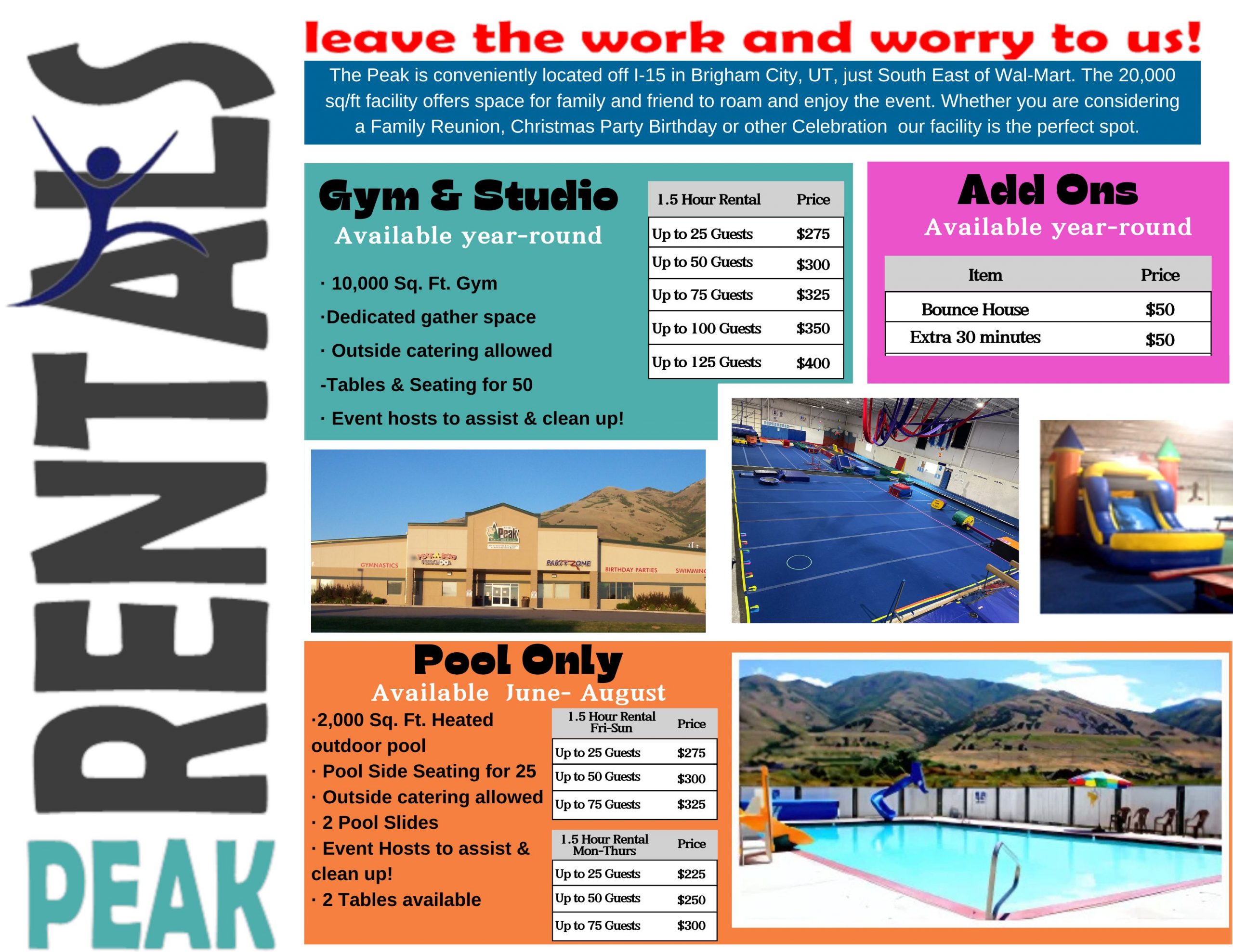 Facility Rental Plan the perfect gathering for friends & family alike at The Peak- FUN for all ages! Click Here To Book Your Event Click Here To Fill Out Your Wavier