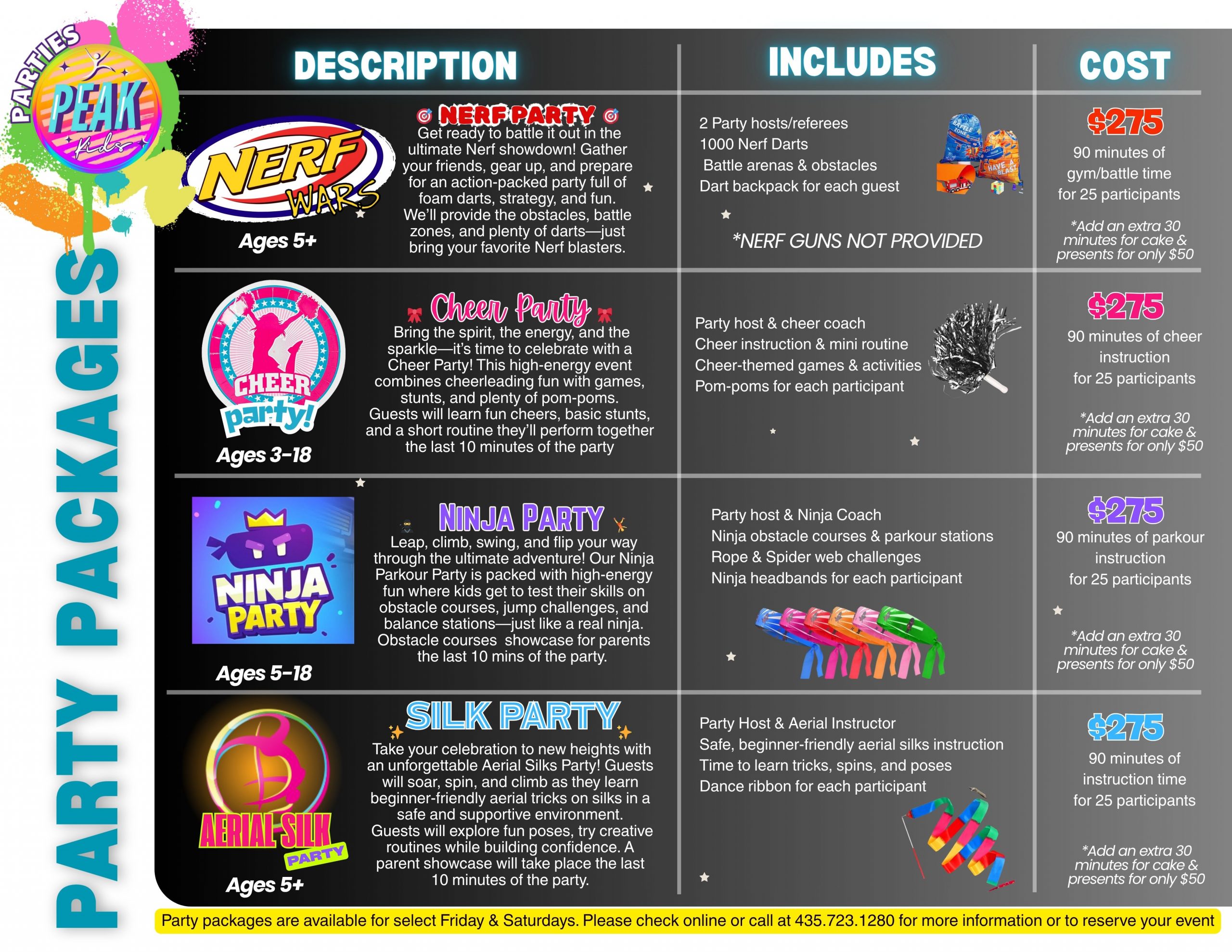 Party Packages Party Packages make any event full of magical memories at The Peak. Click Here To Book Your Party Click Here To Fill Out Your Wavier